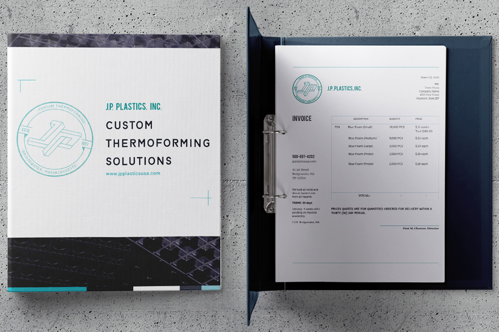 J.P. Plastics is a true family business, owned and operated by husband and wife team John and Amelia Cheever for thirty years. The following Brand Identity honors the history behind the company by bringing tradition and family values into play. J.P.’s commitment to quality and costumer satisfaction is depicted through the use of a style and visual language that speaks of a golden era of industrial American branding.